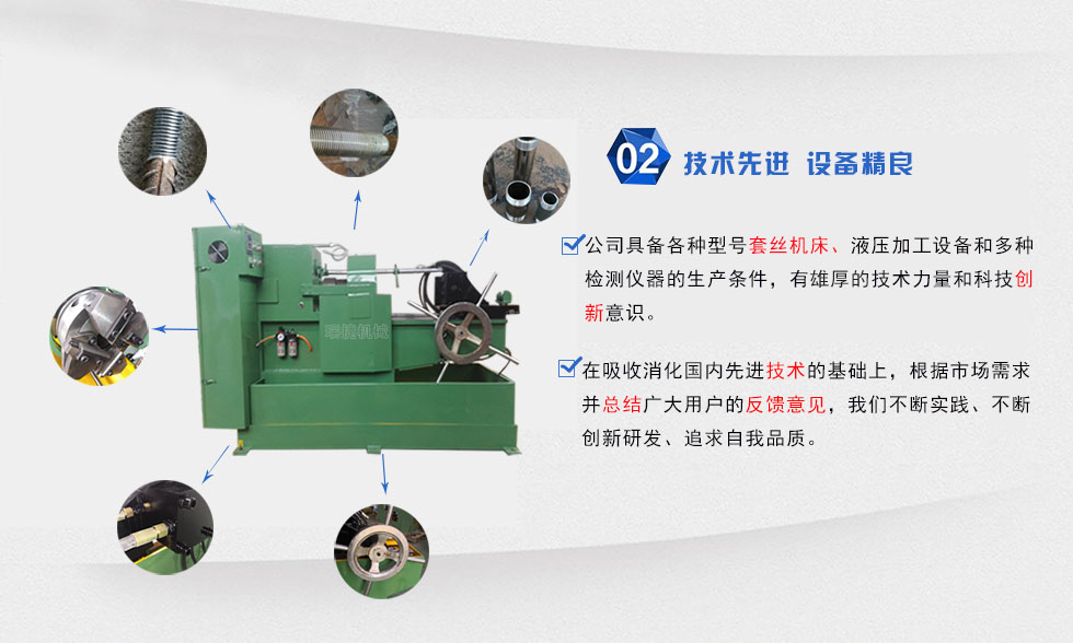 瑞捷套絲機設備采用液壓裝置成功解決勞動強度大,效率低,且無定位裝置,絲扣長短難控制等弊端,可一次型完成螺紋加工成型且螺紋牙形飽滿光滑。套絲機的主要部件及結構是由套絲機床的傳動系統,支架系統,切線板牙頭,定位裝置及液壓系統組成,工作時只要將工件裝入夾鉗,其余程序將自動完成,操作簡單,通俗易懂,瑞捷套絲機廠家直銷,質量有保證,減少不必要的中間環節,為客戶帶來實實在在的優惠政策,歡迎新老客戶洽談合作事宜和來電咨詢.